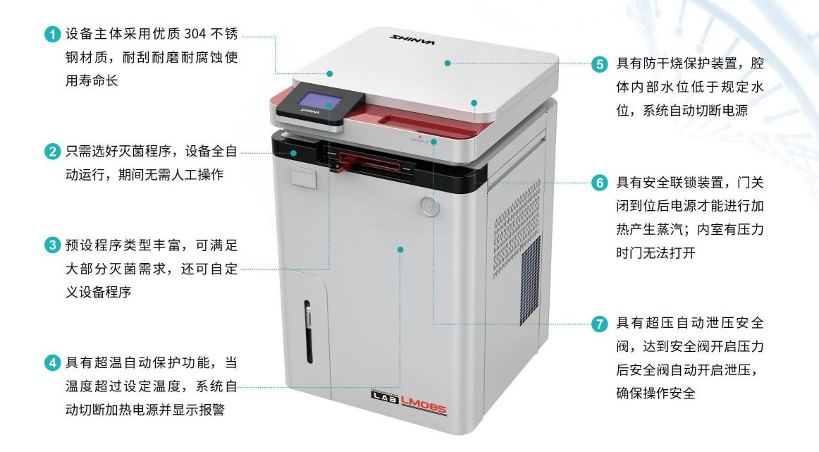 - 具有安全联锁装置,门关闭到位后电源才能进行加热产生蒸汽;内室有压力时门无法打开。