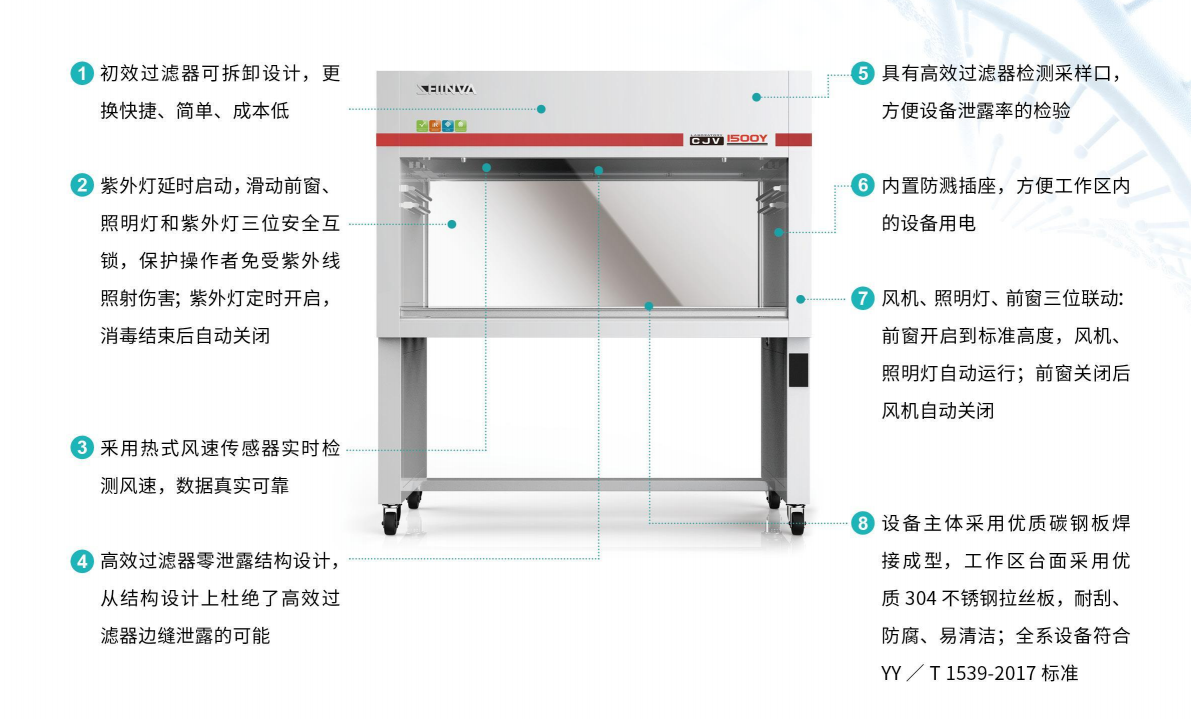 - 设备主体采用优质碳钢板焊接成型,工作区台面采用优质 304 不锈钢拉丝板,耐刮、防腐、易清洁;全系设备符合YY/T1539-2017 标准。
