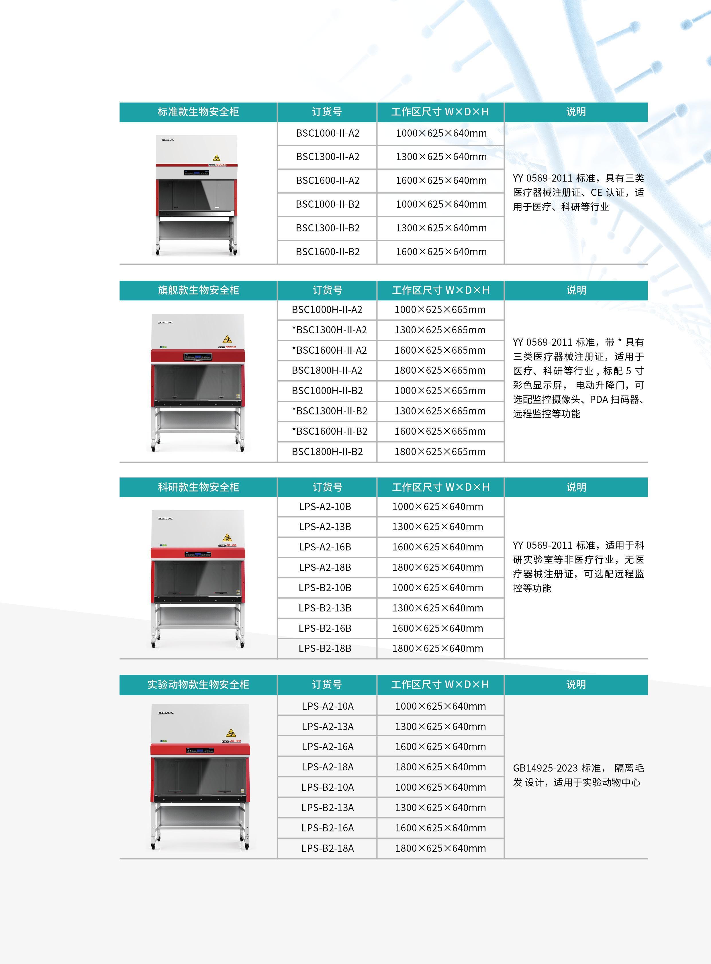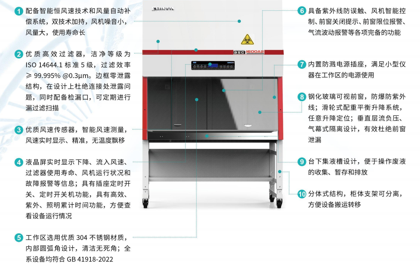 - 工作区选用优质 304不锈钢材质,内部圆弧角设计,清洁无死角;全系设备均符合 GB 41918-2022。