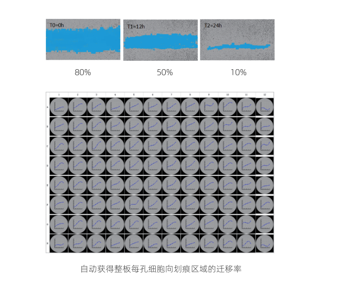 通过计算划痕区域汇合度变化,自动获得整板每孔细胞向划痕区域的迁移率。