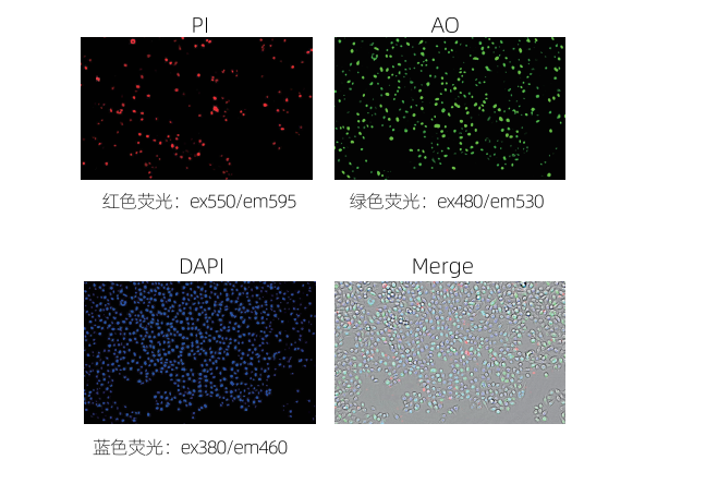 利用明场和红、绿、蓝三色荧光通道,配合活细胞光染料检测细胞凋亡过程。