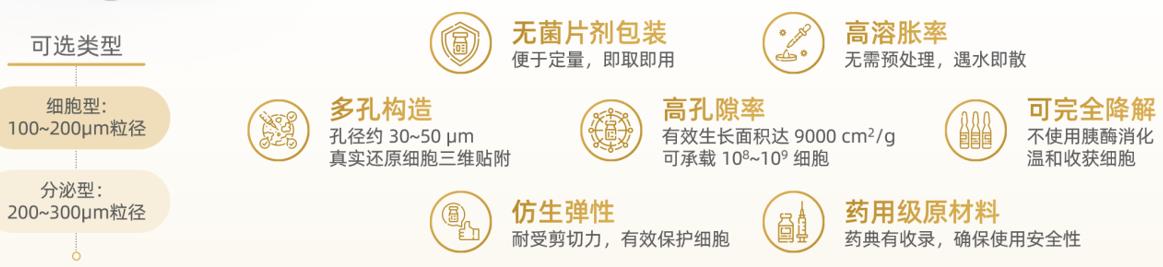 3D TableTrix® 微载体为自主研发产品,由数万颗弹性三维多孔微载体组成,孔隙率>90%,粒径大小可控于50-500μm区间, 均一度≤100μm,形成真正的3D仿生培养。 系列产品可用于贴壁细胞的培养并实现细胞、病毒、细胞产物的收获。该产品已获得2项CDE药用辅料资质,登记号为【F20200000496;F20210000003】,1项FDA-DMF药用辅料资质,登记号为【DMF:35481】